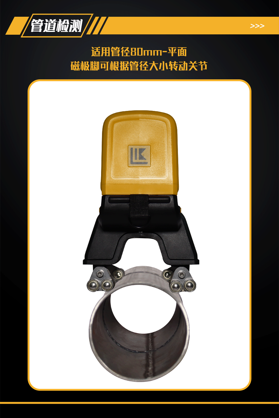 9、可檢測(cè)≥80mm直徑管道焊縫及平板焊縫;磁極腳為可轉(zhuǎn)動(dòng)關(guān)節(jié),可隨不同管徑的工件調(diào)節(jié)磁極角度,使磁極貼合管件弧面,保證探傷效果;配有管道焊縫、平板焊縫檢測(cè)2種規(guī)格磁極腳;