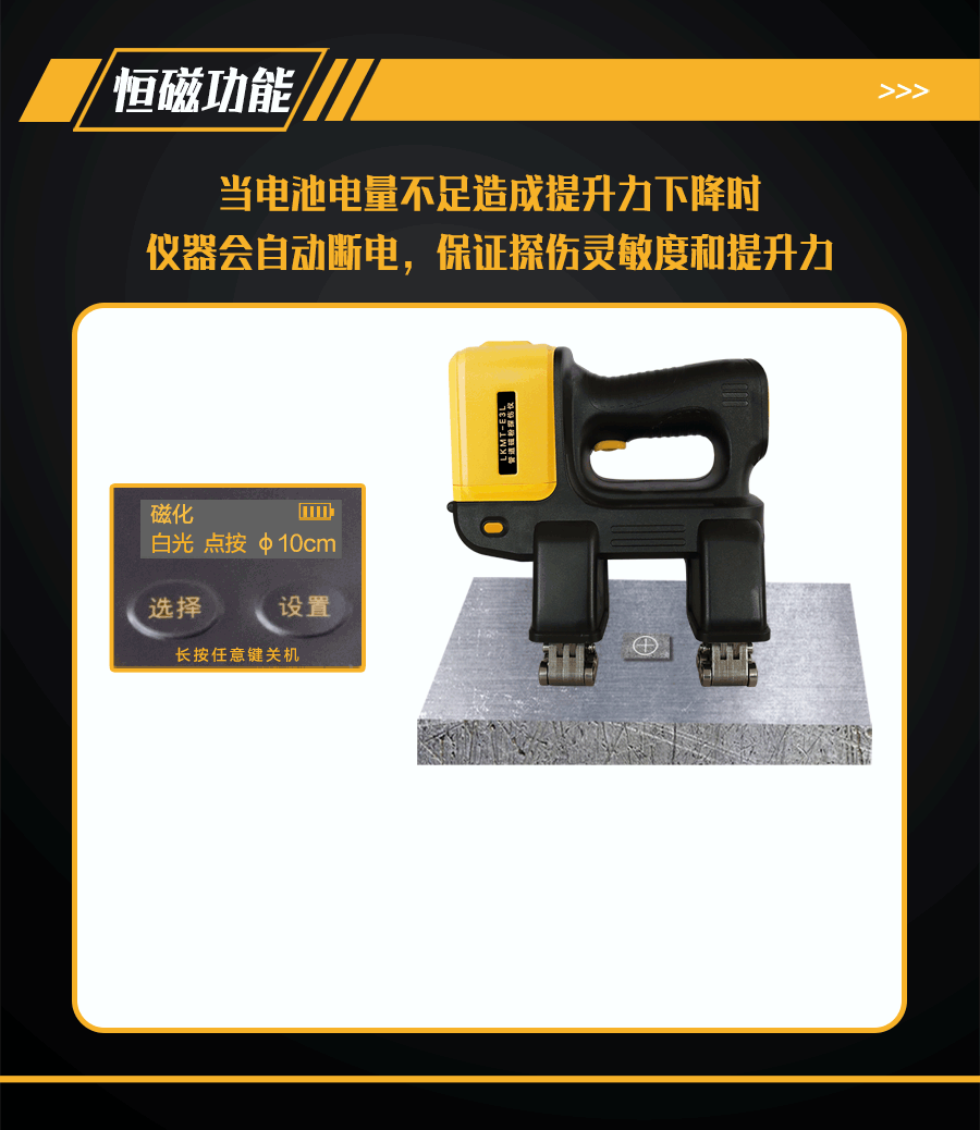 6、恒磁控制功能,因電量下降導(dǎo)致提升力不滿足探傷需求時(shí)自動(dòng)斷電,保證探傷靈敏度;