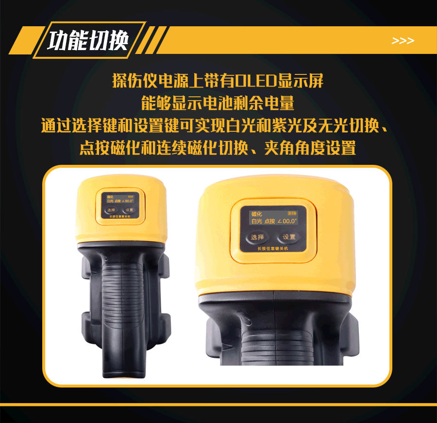 4、鋰電池電源帶有OLED顯示屏及操作按鍵;可顯示及設置剩余電量和電壓、點按磁化或連續磁化工作模式、紫外線或白光照明模式;