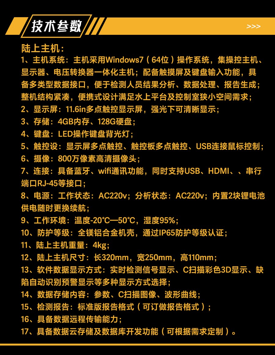 1、主機系統:主機采用Windows7(64位)操作系統,集操控主機、顯示器、電壓轉換器一體化主機;配備觸摸屏及鍵盤輸入功能,具備多類型數據接口,便于檢測人員結果分析、數據處理、報告生成;整機結構緊湊,便攜式設計滿足水上平臺及控制室狹小空間需求;